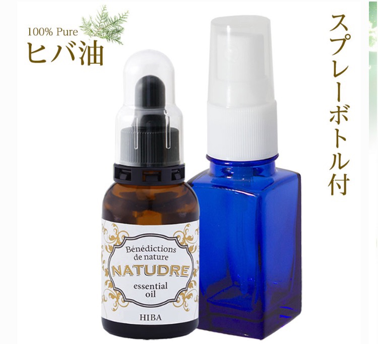 正確に言うと原液そのままは使えないので、青いスプレーボトルにヒバ油を2滴と水20mlを入れてよく振ってから使います。