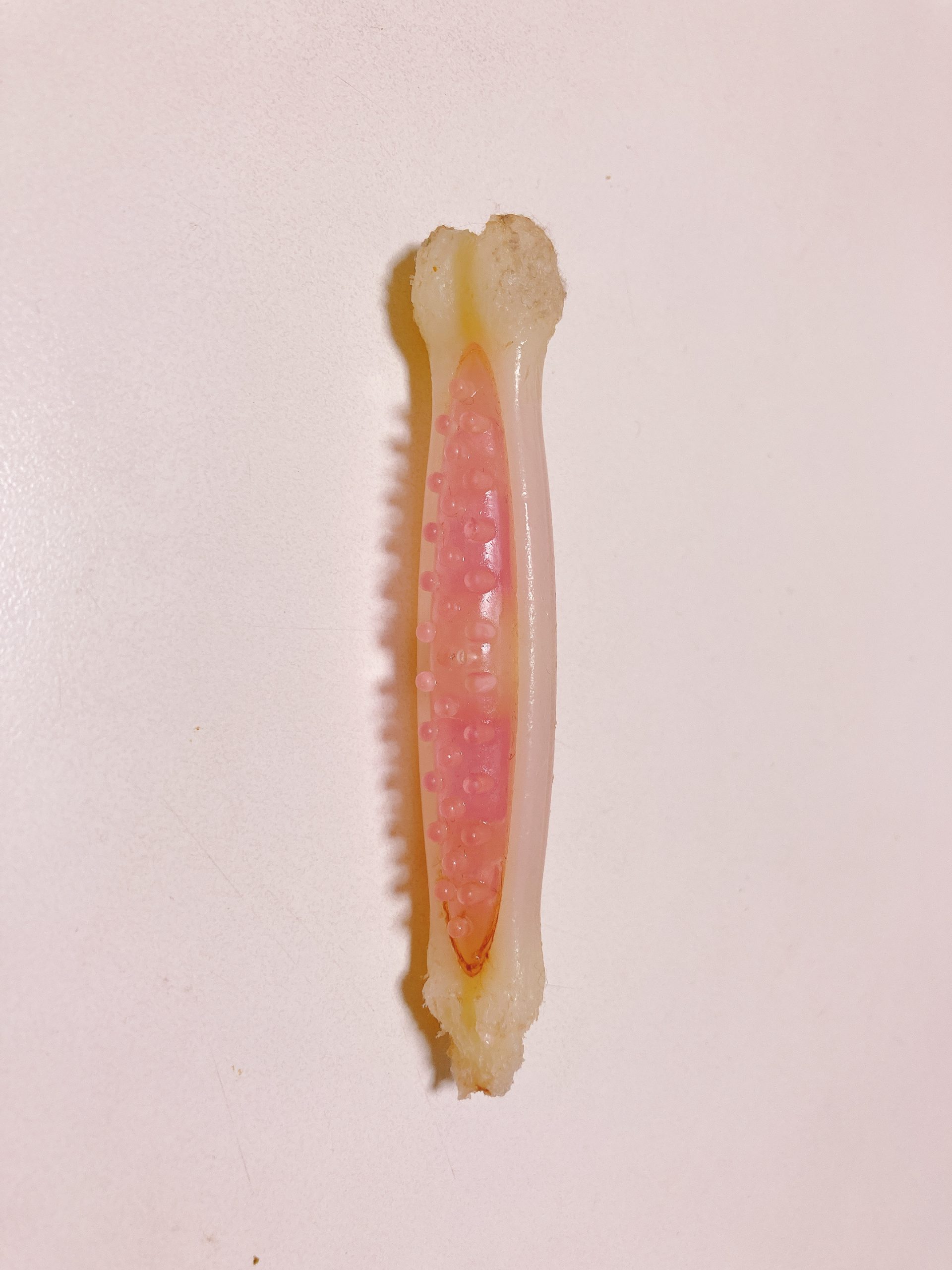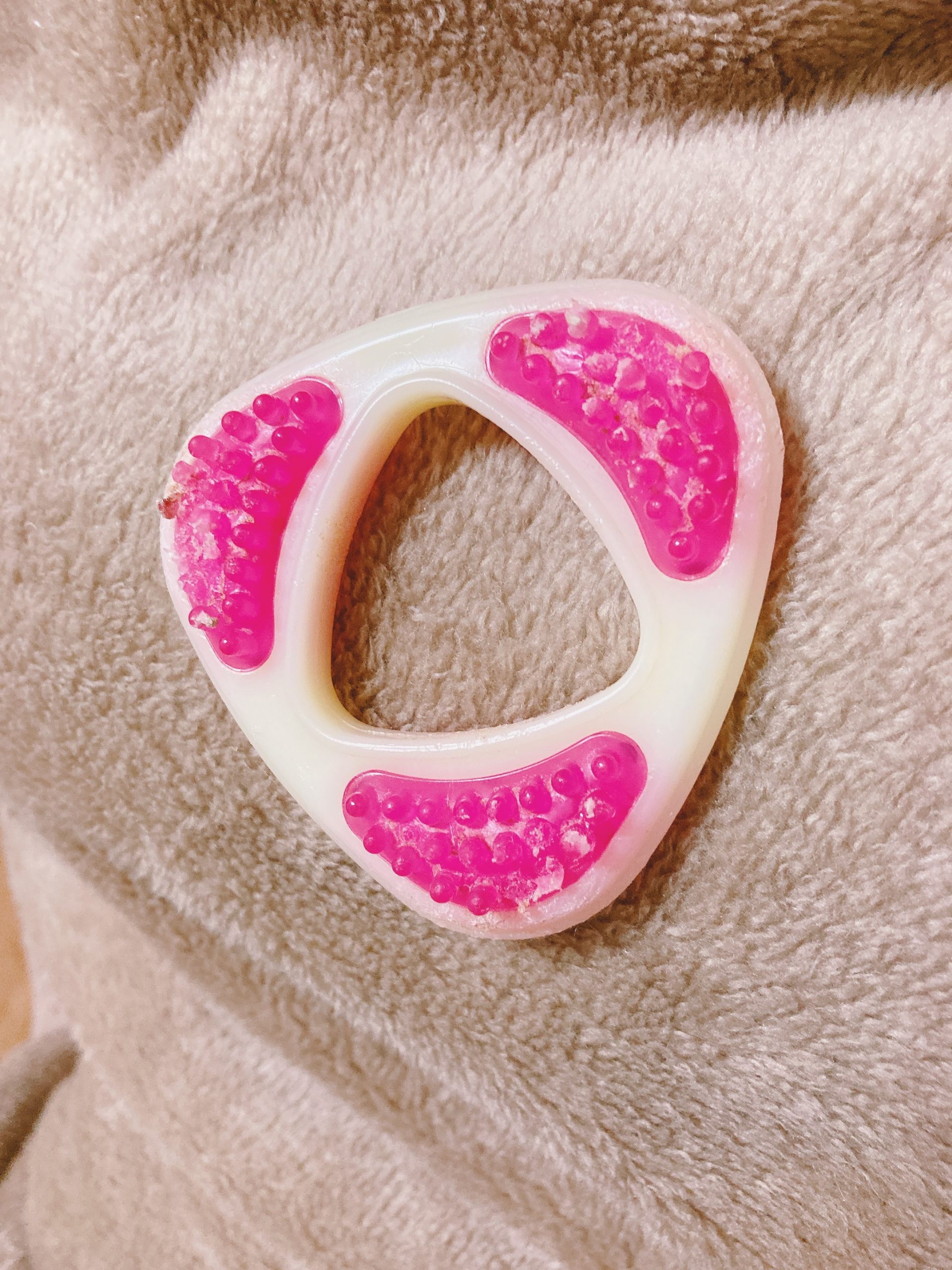 こんな感じで…。ピンクの部分は大丈夫だけど周りを噛む方が楽しいみたいでこんな風になっちゃいました。